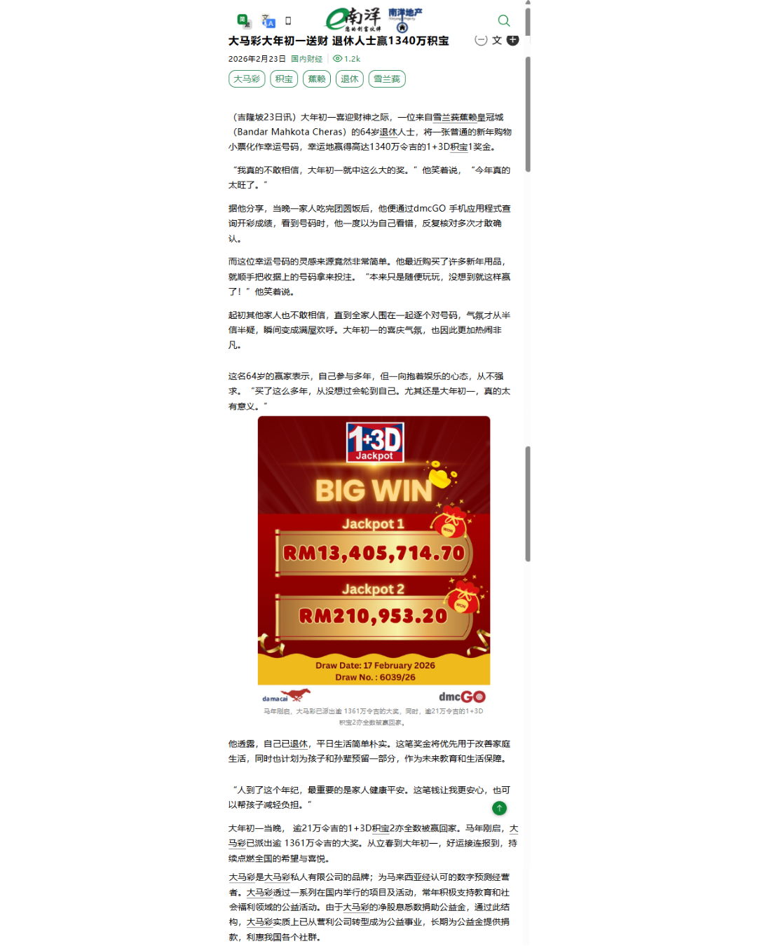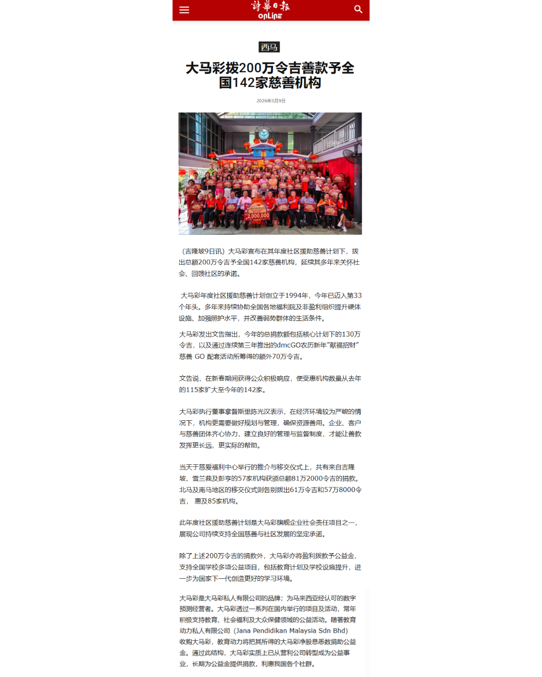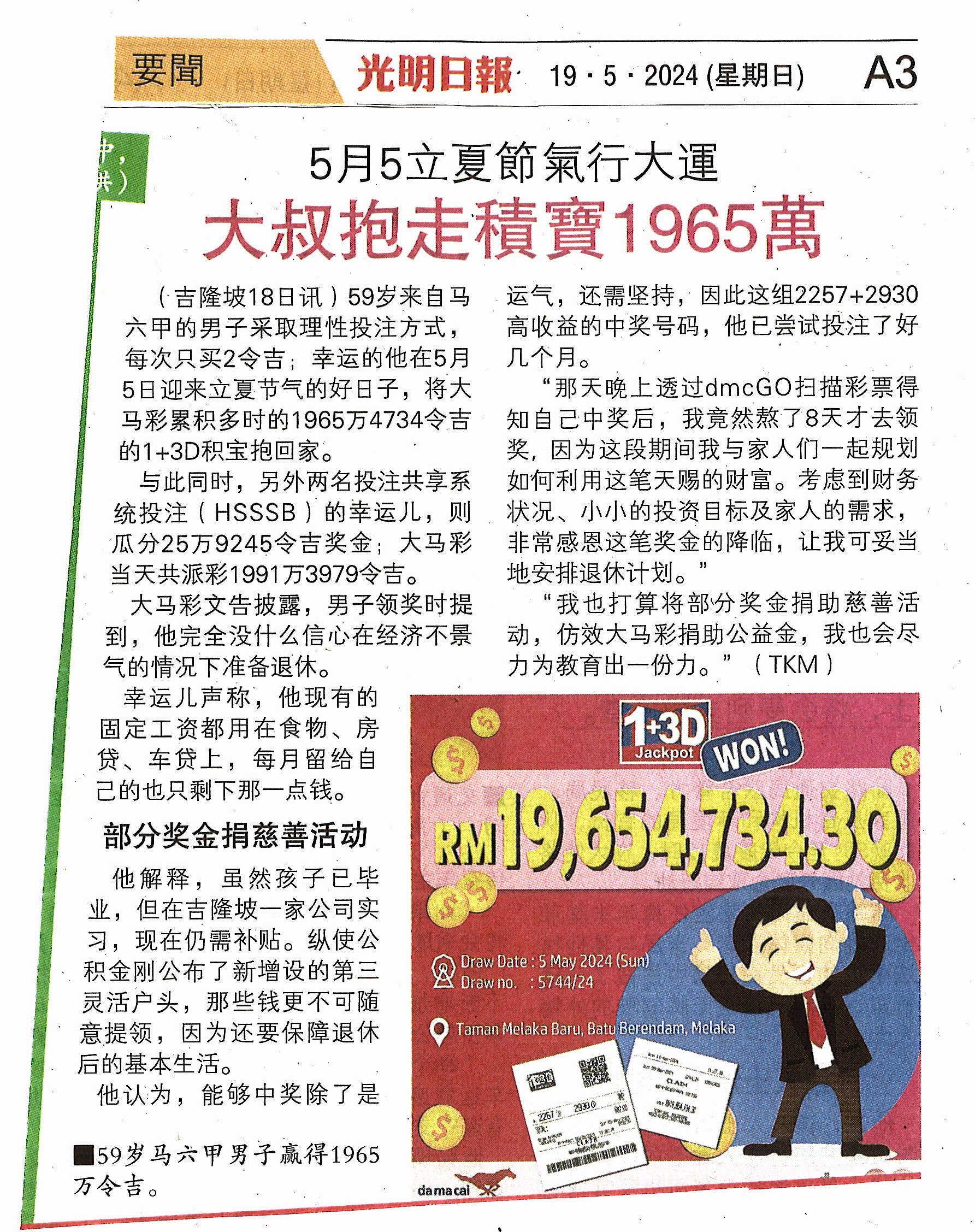 Da Ma Cai is featured in major dailies over a wide range of activities especially in the areas of education and social welfare, as well as news featuring our promotional campaigns and contests for loyal customers, and winning stories on our lucky Jackpot winners are also featured here.